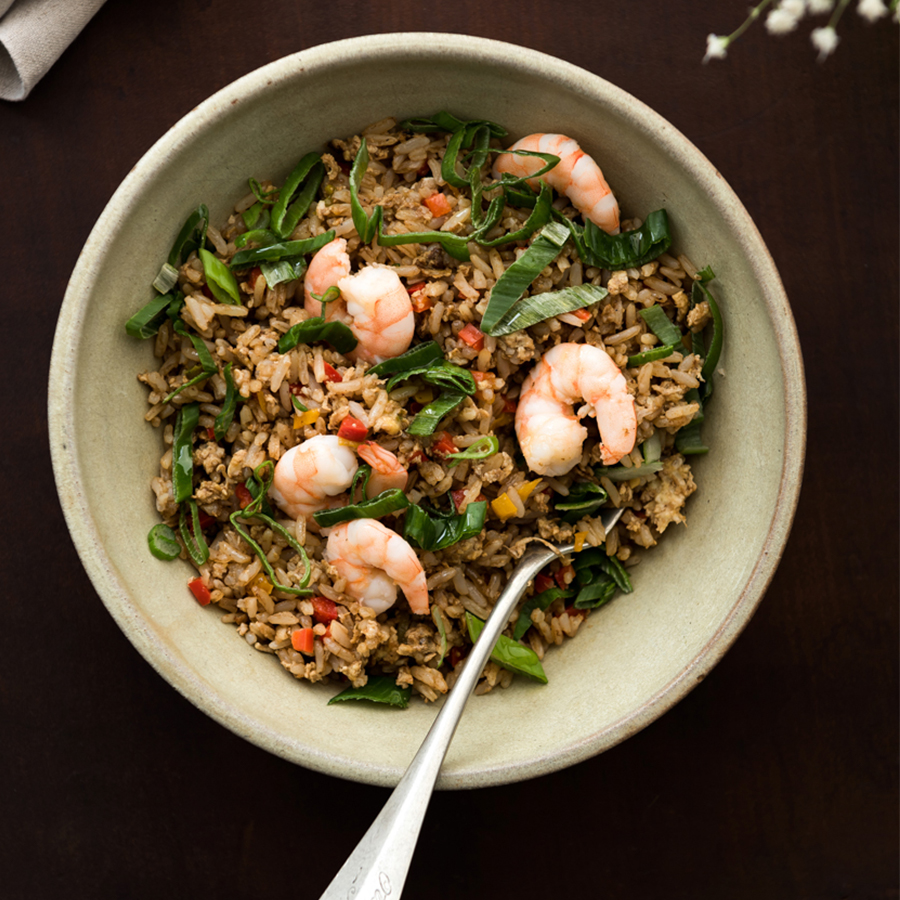Arroz saltado al wok con soja, aceite sésamo, pimientos, cebollin y camarón.