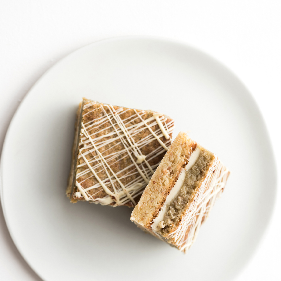 Brownie de almendra, capa de chocolate blanco republica del cacao y brownie de té matcha