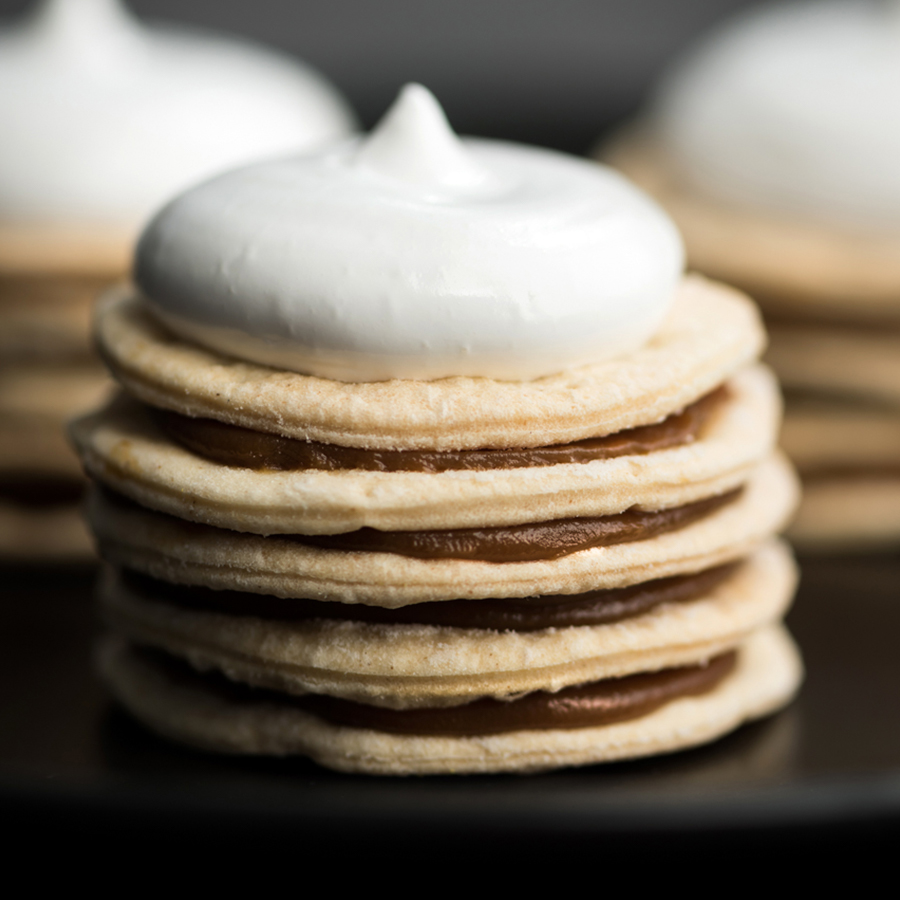 5 capas de hoja, rellenas con el mejor dulce de leche, topping de merngue italiano, coronado por un delicioso macaron